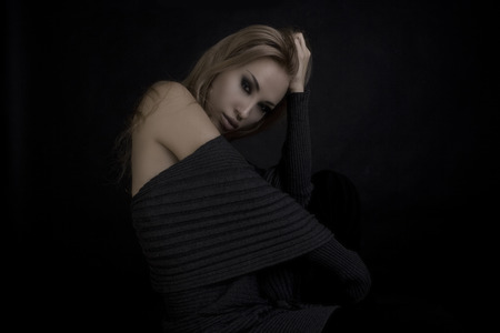 Portrait of Beautiful Young Sexy Blond Woman at Gray Casual Dress in Studio, looking at the camera. Dark Background. Smokey Eyes Makeup and Naturally Styled Long Hair.