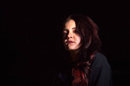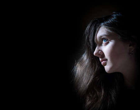 Portrait of a beautiful young woman on a dark background. Close-up.