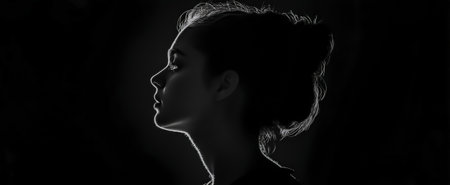 A captivating profile silhouette of a young woman captured in a serene moment, with soft blue lighting creating a tranquil and artistic atmosphere.