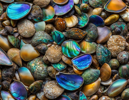 AI Generated. A collection of iridescent seashells on a reflective, colorful surface illuminated by light
