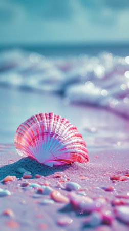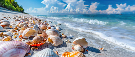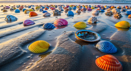 Discover a captivating scene of colorful seashells scattered on sandy shores, gently kissed by the waves. The vibrant hues and sparkling sunlight create a tranquil beach environment.
