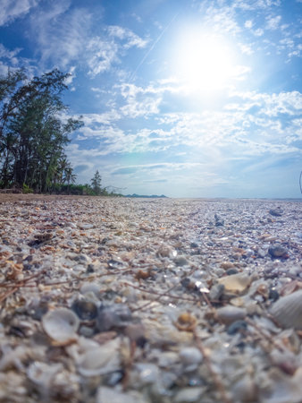 A sandy beach with a wide shore dotted with sea shells, where every step reminds of adventures at.