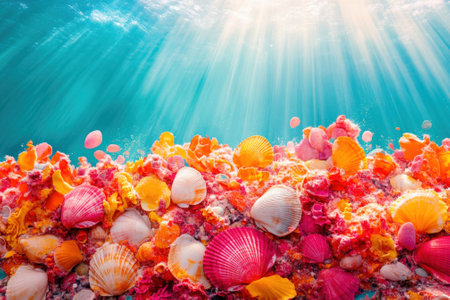 This vibrant underwater environment showcases a variety of shells and pebbles basking in sunlight. The interplay of colors creates a captivating natural display at ocean depth.
