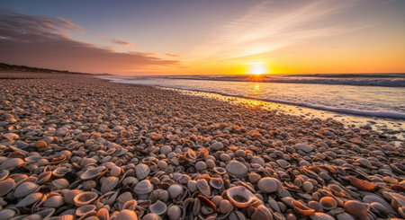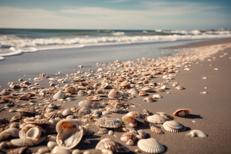 Seashells scattered on a serene beach with soft sand and gentle waves in the background, capturing the peaceful essence of a coastal environment. ideal for themes of relaxation, holidays, and natural beauty.