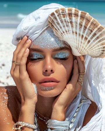 Serene Beauty on the Shore. Woman with Glittering Makeup Holds a Seashell Posing on a Tropical Beach