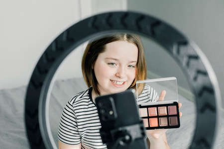 Teenage girl, beauty blogger filming video for channel blog, showing eye shadow. Telling and showing makeup and does invisible natural makeup. Beauty, technology, communication teenagers online