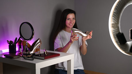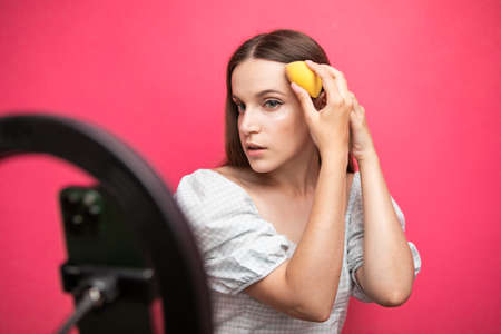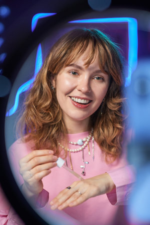 Smiling beautiful young woman shooting review of new skin foundation in light on circle lamp