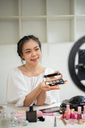 An attractive and happy young Asian female beauty blogger reviewing new products and recording her makeup tutorial video in her home studio. content creator, influencer, fashion and beauty blogger