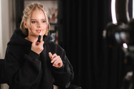 Beautiful blond hair blogger applies lipstick. Woman making a video for her blog