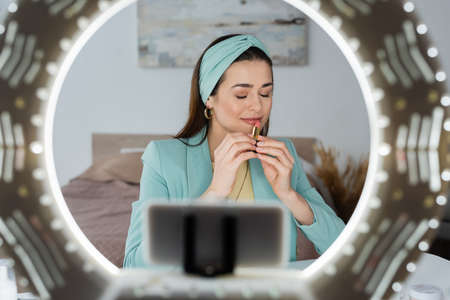 beauty blogger enjoying flavor of lipstick near blurred smartphone in holder with ring light