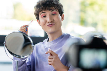 Transgender person holding lip balm and pouting lips near mirror and digital camera