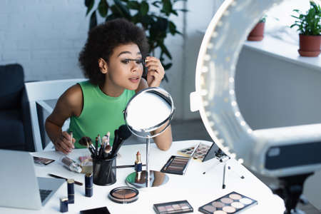 Pretty african american blogger applying mascara near mirror, gadgets and decorative cosmetics at home