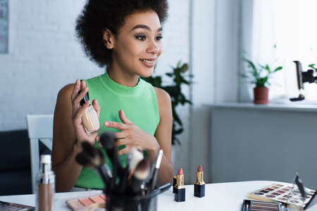 Side view of african american blogger holding face foundation near cosmetics and smartphone on table