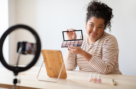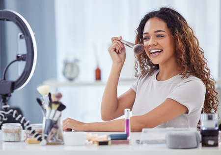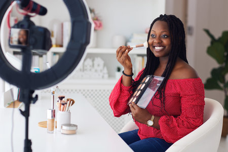 happy young african american woman streaming a beauty vlog from home, online content creator applying a makeup on