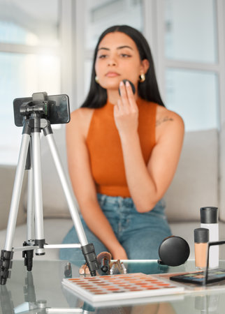 Vlogger concept: Beauty guru recording a make up tutorial video.