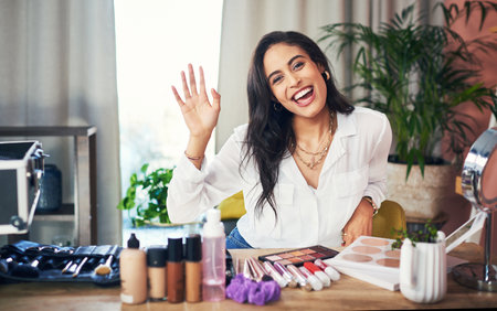 Beautiful woman with a social media influence is greeting the audience for recording vlog video live streaming, Showing how to make up and use cosmetics, Online business on concept of beauty bloggers.
