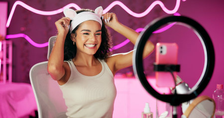 Woman, content creator and ring light for streaming, webcam and beauty for influencer person in home. Tutorial, talking and cellphone for followers on social media, cosmetics and vlog for recording