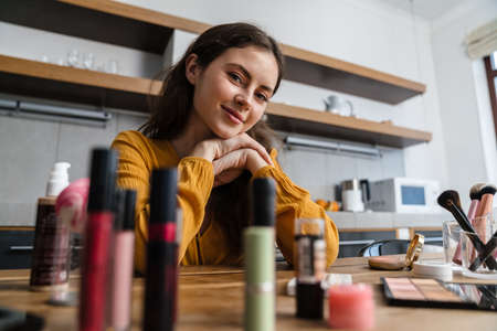 Smiling young brunette woman doing makeup while sitting in the kitchen at home
