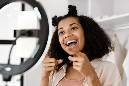 Happy young african woman influencer standing in front of a camera at home making vlog