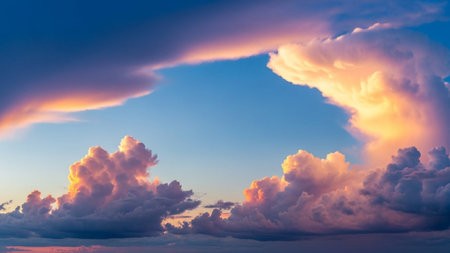 Towering cumulus clouds catch the golden light of sunset, casting dramatic shadows against a deep blue sky with...