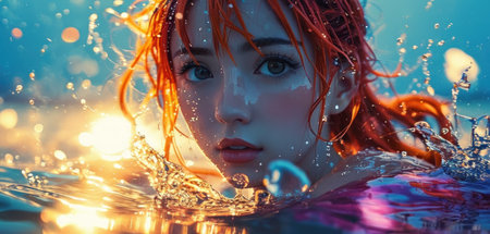 A captivating portrait of a woman submerged in water with sunlight reflecting on her face, creating a serene and artistic effect, representing beauty, nature, and calmness.