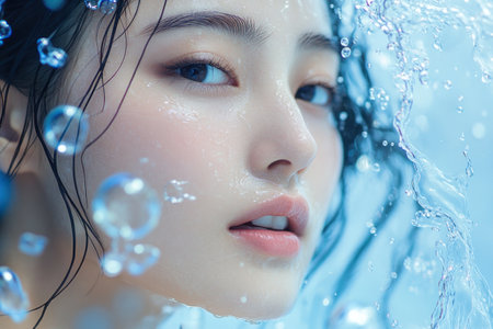 A young Asian woman with a serene expression is captured mid-motion, as water splashes gracefully around her face against a soft blue background. This enchanting image evokes feelings of tranquility and freshness, highlighting the delicate interplay between beauty and nature.