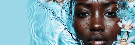 portrait of a beautiful African American girl in close-up, splashes of water, white flowers, clean skin concept, horizontal banner for beauty and cosmetology