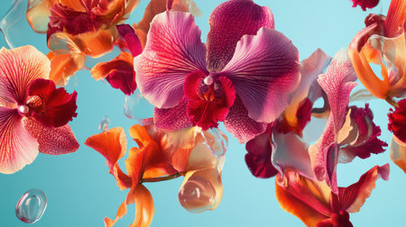 A stunning composition of vibrant orchid blooms floating gracefully in a serene underwater environment, capturing the beauty of nature's floral elegance.