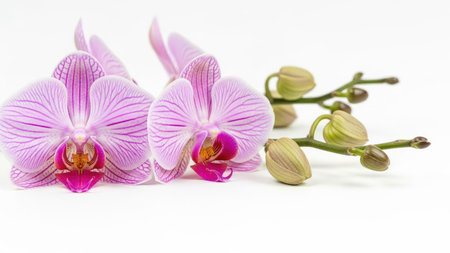 Orchid flowers with delicate petals and vibrant centers are displayed against a smooth, purple background. The image showcases soft lighting and a close-up composition, highlighting the texture and details of the blooms. It may be suitable for botanical illustrations, decorative designs, or artistic projects.