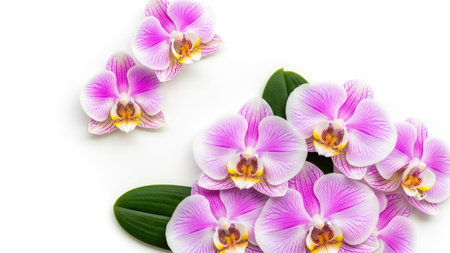 Orchid with leaves pattern on side position provides copy space for text. background concept isolated white