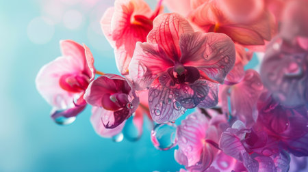 A stunning arrangement of vibrant orchid flowers in blue and pink hues set against a soft gradient background. Perfect for floral designs and nature themes.