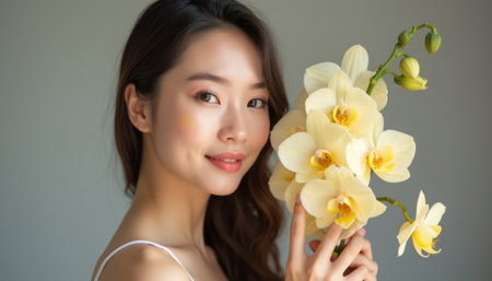 A stunning young woman with long, flowing hair gently cradles a bouquet of vibrant yellow orchids, radiating beauty and grace. Her warm smile and soft features create an inviting atmosphere, celebrating the harmony between nature and femininity.
