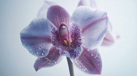 Captivating close-up of an orchid flower showcasing its stunning petals adorned with water droplets, embodying natural beauty and elegance perfect for various uses in photography and art.