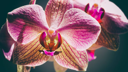 A stunning pink orchid flower is showcased on a soft pink background, highlighting its delicate petals and intricate patterns, perfect for floral and nature-inspired projects.