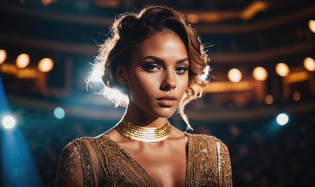 A woman in a sparkling gold dress poses on a stage, lit by spotlights