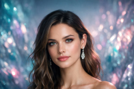 Beautiful Young Woman With Earrings On Shimmering Background