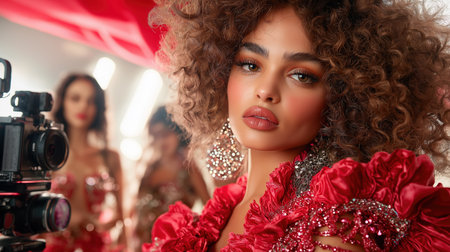 Portrait of a woman with large curly hair wearing a dramatic red dress posing in studio.