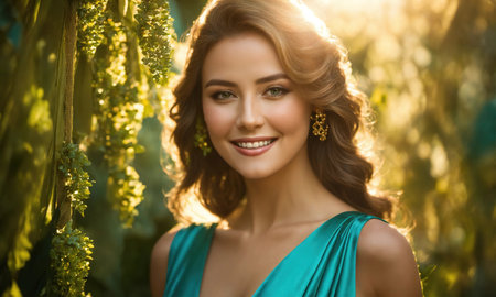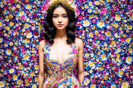 A serene young woman dressed in a green outfit adorned with delicate flower embellishments, stands out in a softly lit setting, her gaze tender, exuding an air of quiet confidence and grace.