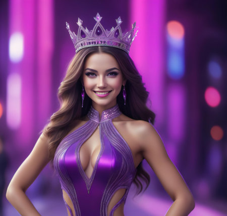 Beautiful brunette woman in purple evening dress with crown on head.