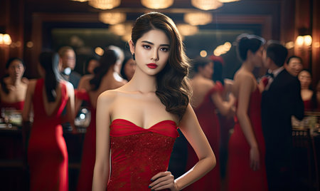 A woman dressed in a shimmering gown stands confidently at a vibrant celebration. Surrounded by guests, the event is filled with lights, music, and joy, highlighting the festive ambiance.