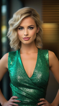 Beautiful young blonde with bright makeup in a green sequin dress on dark background. Vertical format. Ideal for fashion, event promotions, or luxury content.