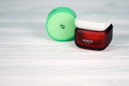 KHARKIV, UKRAINE - DECEMBER 16, 2021: Kiko Milano cream jars with company logo. Kiko Milano is a famous Italian cosmetics brand