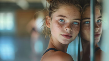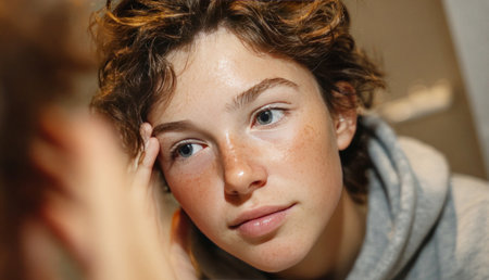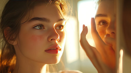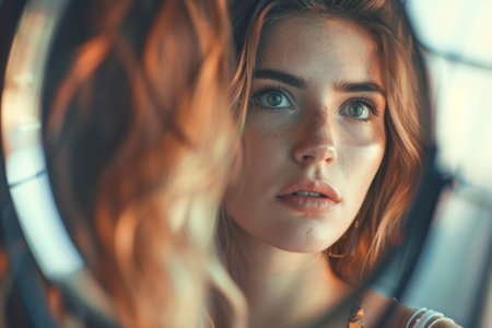 This close-up portrait captures a young woman's natural beauty and freckles as she gazes thoughtfully into a mirror, revealing her emotions in soft, warm light.