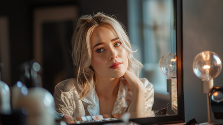 A young woman gazes thoughtfully in a mirror while sitting indoors in soft natural light