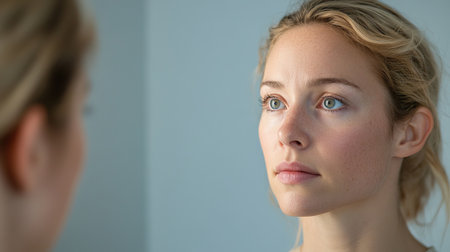 A woman stands in front of a mirror, observing her own reflection with a calm and thoughtful demeanor. The soft lighting highlights her features, creating an intimate atmosphere for self-reflection.