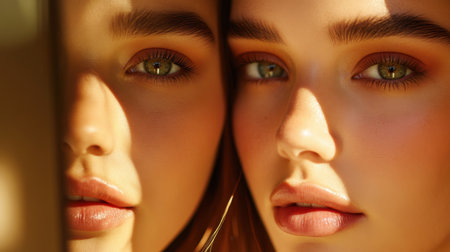 A stunning portrait of a young woman with striking green eyes, captured in soft lighting. The reflection adds depth and highlights her natural beauty.
