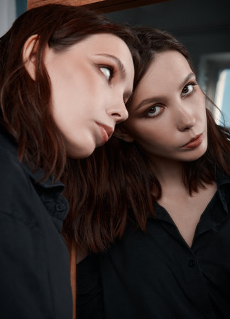 Model posing near the mirror stares intently at camera. Closeup portrait Bright evening makeup red lips cat eyes bare shoulder. Elegant fantastic hairstyle of long hair front. backdrop Girl mirroring