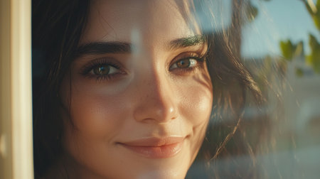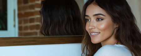 A woman with long dark hair smiles gently while looking at her reflection in a mirror. The warm decor and natural light create a comfortable atmosphere enhancing her cheerful expression.