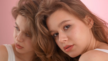 Portrait of a Young Woman Reflected in a Mirror on Pink Background