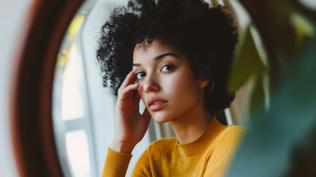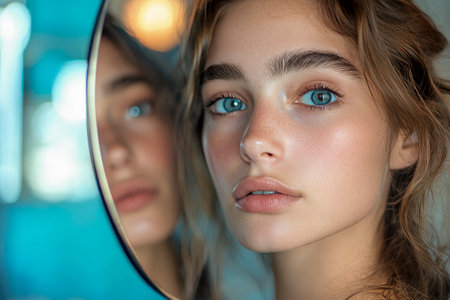 young and beautiful woman looking in a mirror generative ai